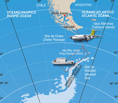 飞行线路: 蓬塔阿雷纳斯,智利 —— 智利弗雷站,乔治王岛 之后可以乘坐南极破冰船开始为期6天的南极半岛之旅。也可以根据个人爱好,要求前往极点体验,或者攀登南极高峰文森峰,和露营等活动。
